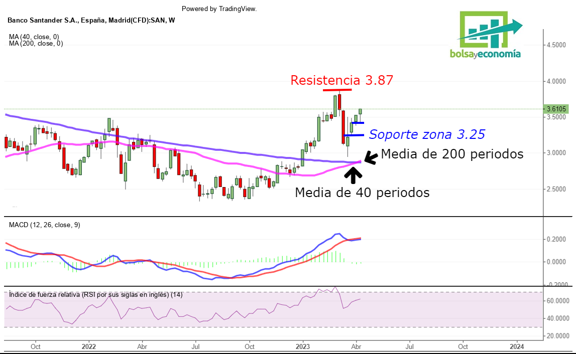 Por la parte de arriba, vamos a ver si las acciones de Banco Santander son capaces de dejar atrás de una forma clara la zona de los 3.60 euros, ya que ese movimiento nos marcaría fuerza para poder ir a buscar ya los máximos del mes de marzo del este año 2023 que tenemos sobre el nivel de los 3.87 euros por acción.