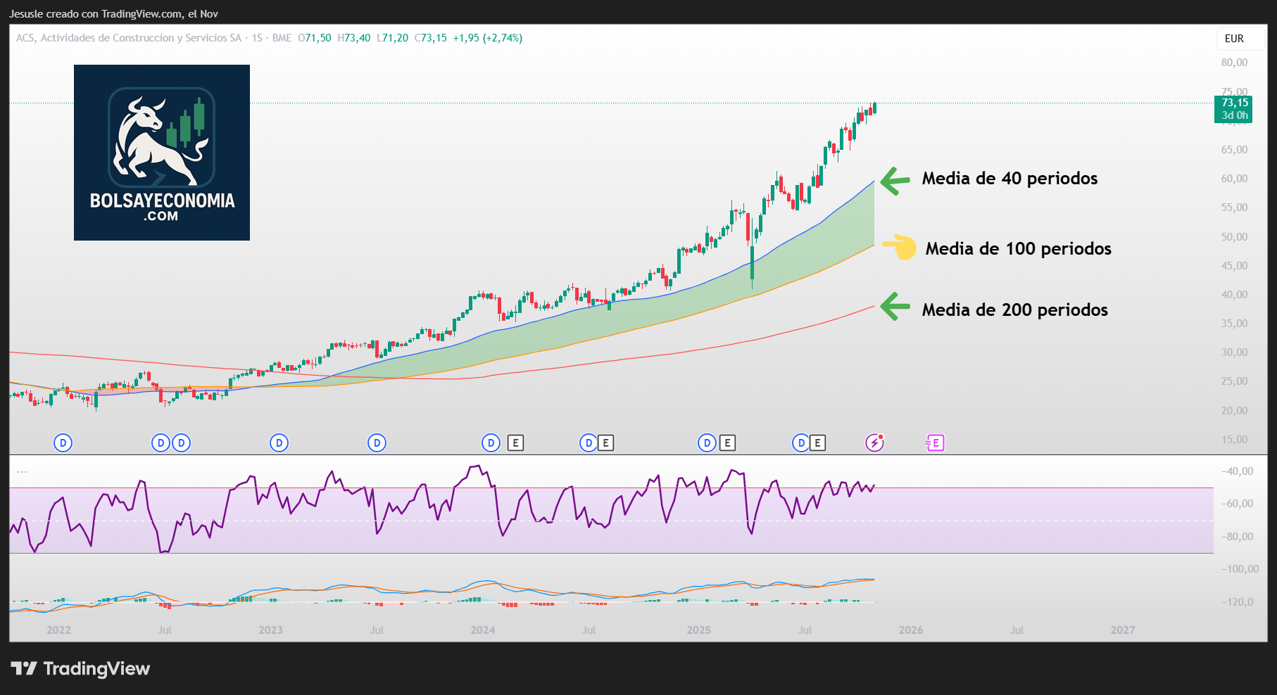 Cabe destacar que las medias de 40, 100 y 200 periodos en gráfico semanal se mantienen por debajo de la cotización de ACS. Por lo tanto, la tendencia de corto, medio y largo plazo sigue siendo alcista en estos momentos.