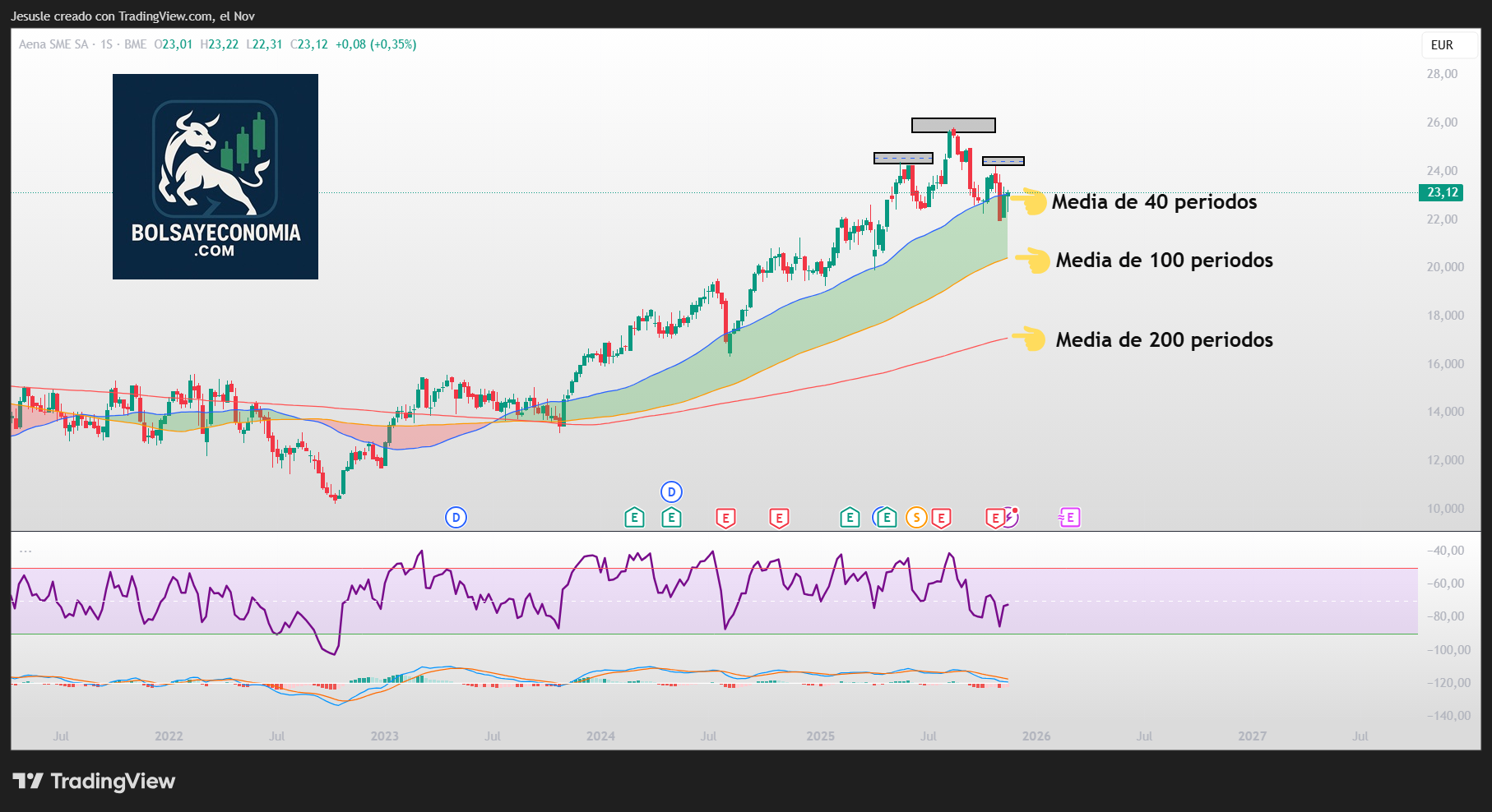 De momento, las medias de 100 y 200 periodos no cambian de situación y siguen por debajo de la cotización de Aena, dejando alcista la tendencia de medio y largo plazo en estos instantes.