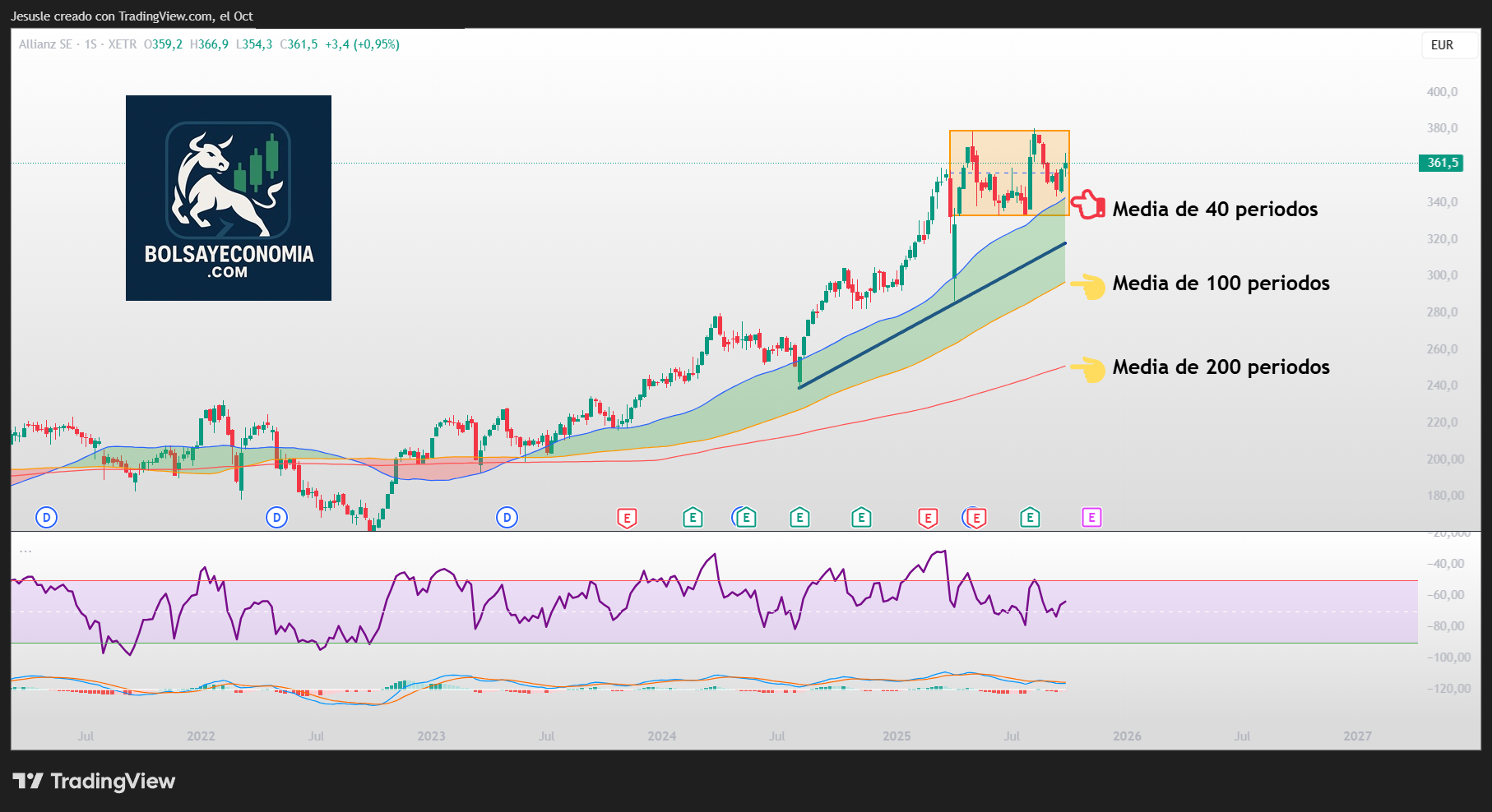 Otro detalle a tener en cuenta es que sigue por encima de las medias de 40, 100 y 200 periodos, lo que reafirma la tendencia alcista actual sobre las acciones de Allianz.