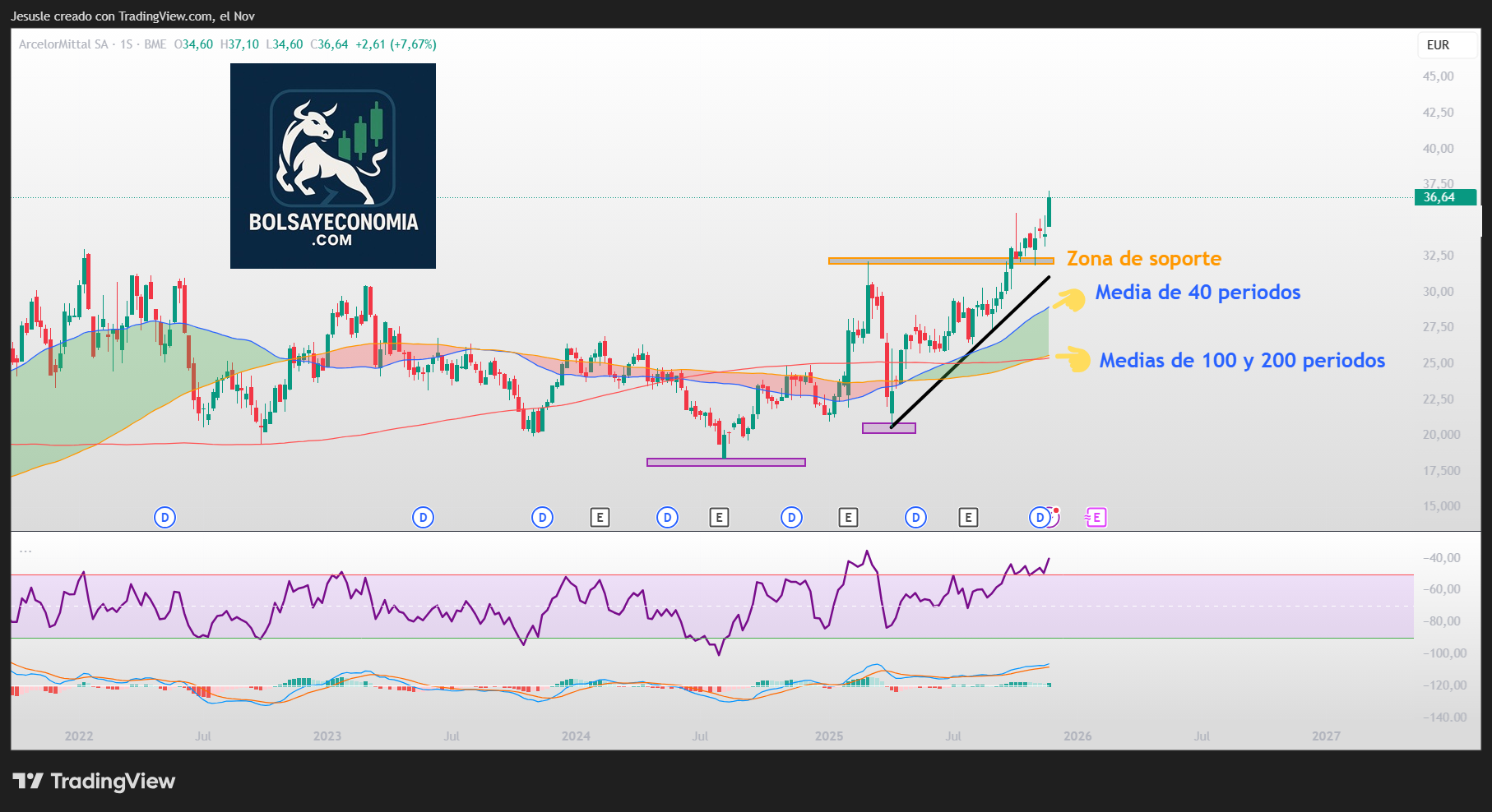 Otro detalle importante es que el precio continúa por encima de las medias de 40, 100 y 200 periodos en gráfico semanal. Por lo tanto, hay que seguir considerando alcista la tendencia actual de corto, medio y largo plazo sobre ArcelorMittal.