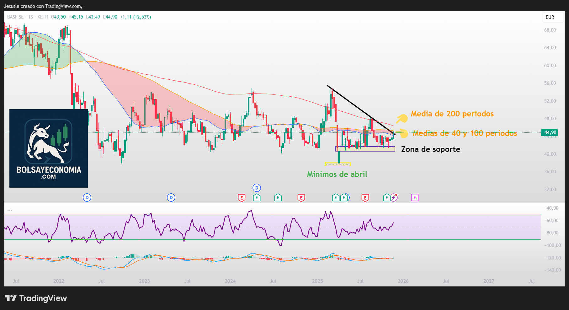 Otro detalle muy importante es que la cotización de BASF está buscando recuperar las medias de 40 y 100 períodos en gráfico semanal. Vamos a ver si lo consigue, ya que sería una buena señal.