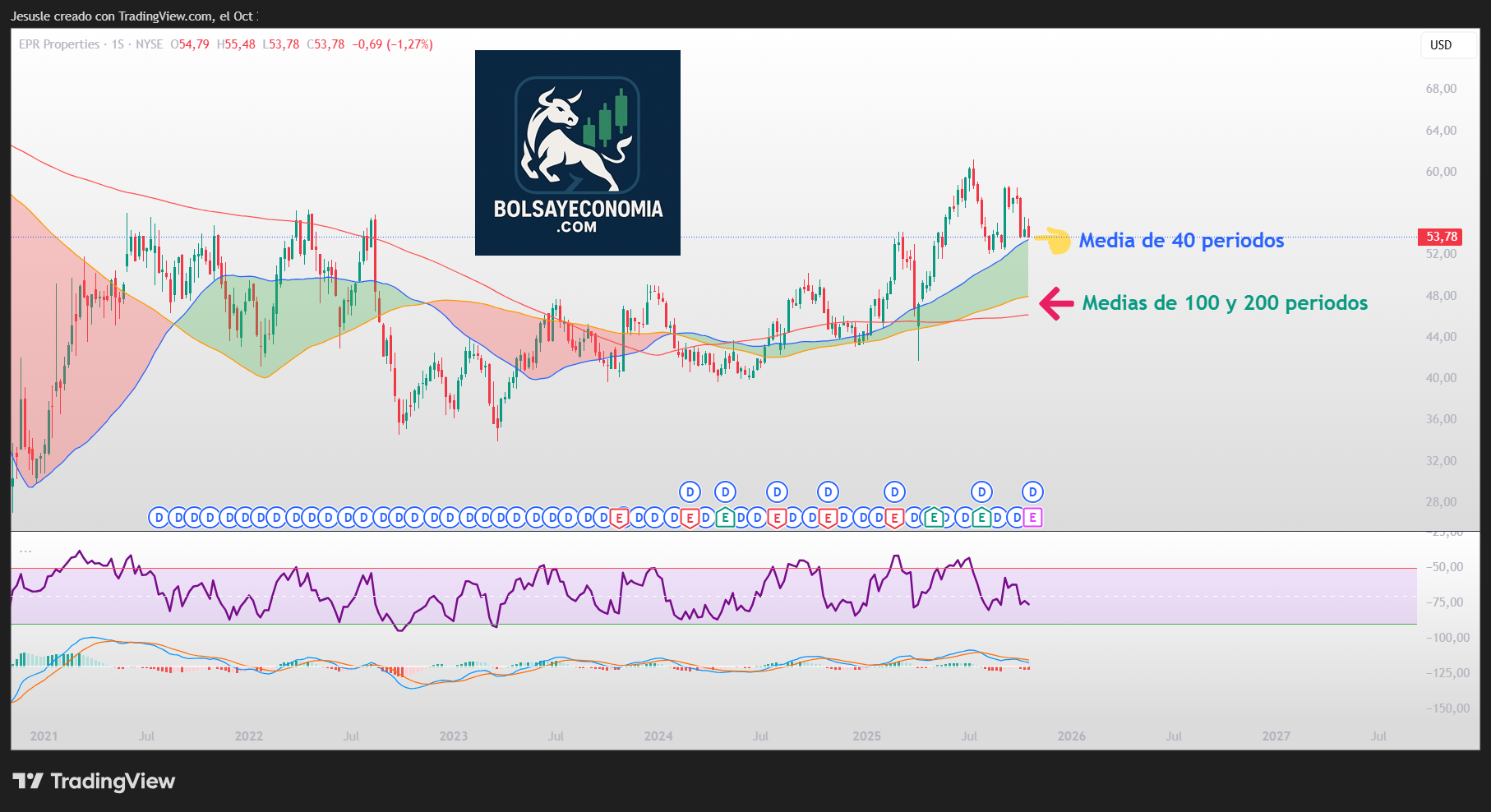 Si miramos por la parte de arriba, la primera resistencia a tener en cuenta sobre EPR Properties la situaremos en la zona de los 56 $.