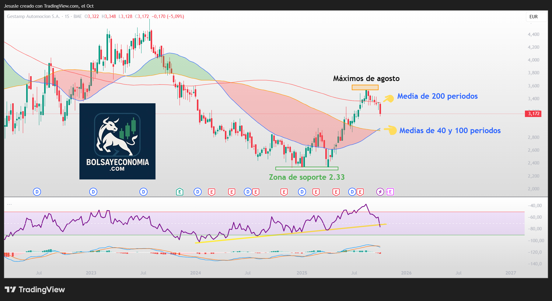 Esa es muy importante, y es que por ahí tenemos pasando ahora las medias de 40 y 100 periodos en gráfico semanal. Por lo tanto, bajo ningún concepto deberíamos ver que las visita para finalmente perderlas.