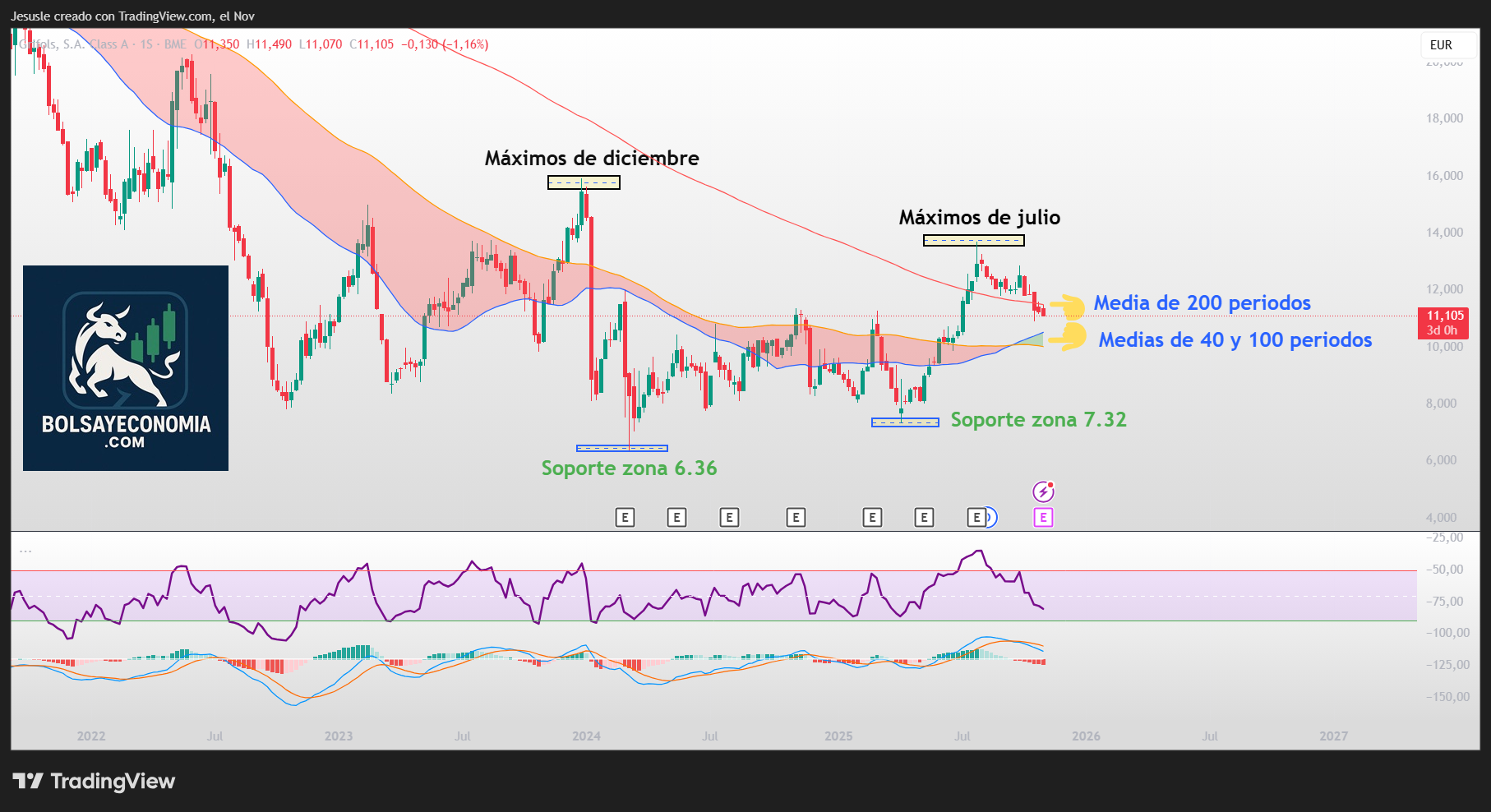 En caso de que tampoco aguantara, el siguiente soporte clave estaría en la zona de los 10 €, donde pasa ahora la media de 100 periodos semanal.