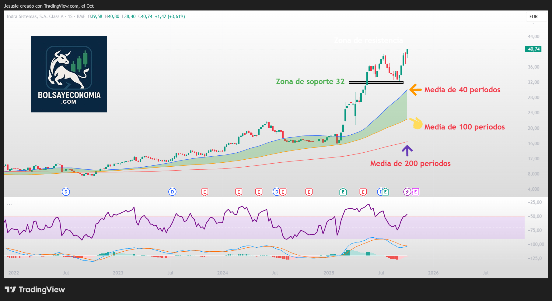 En el gráfico de las acciones de Indra se puede ver que nada cambia y siguen marcando fuerza, lo cual es una buena señal.