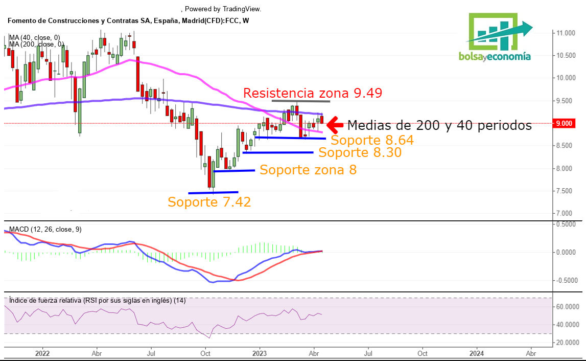 Me fijo en primer lugar en las resistencias sobre las acciones de FCC y tal como os he puesto en el titular, toda la clave se encuentra sobre los máximos del mes de marzo de este año 2023. Comentaos que esos los vamos a tener para ser exactos sobre los 9.49 euros por acción.