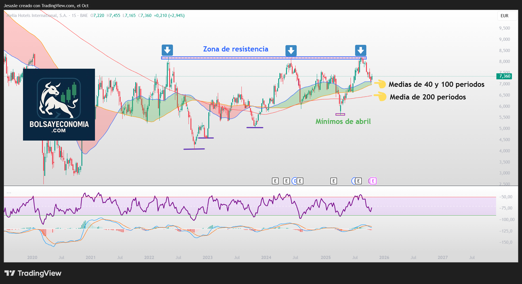 Gráfico semanal analizado sobre las acciones de Meliá Hotels
