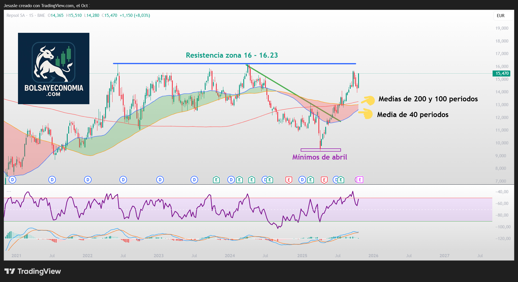 Repaso las resistencias en primer lugar sobre las acciones de Repsol, y en estos momentos vamos a tener en cuenta que, si consigue recuperar el nivel de los 15,70 € (máximos del pasado mes de septiembre), activaría fuerza de nuevo para mirar hacia la zona de los 16 – 16,23 € como siguiente objetivo al alza.
