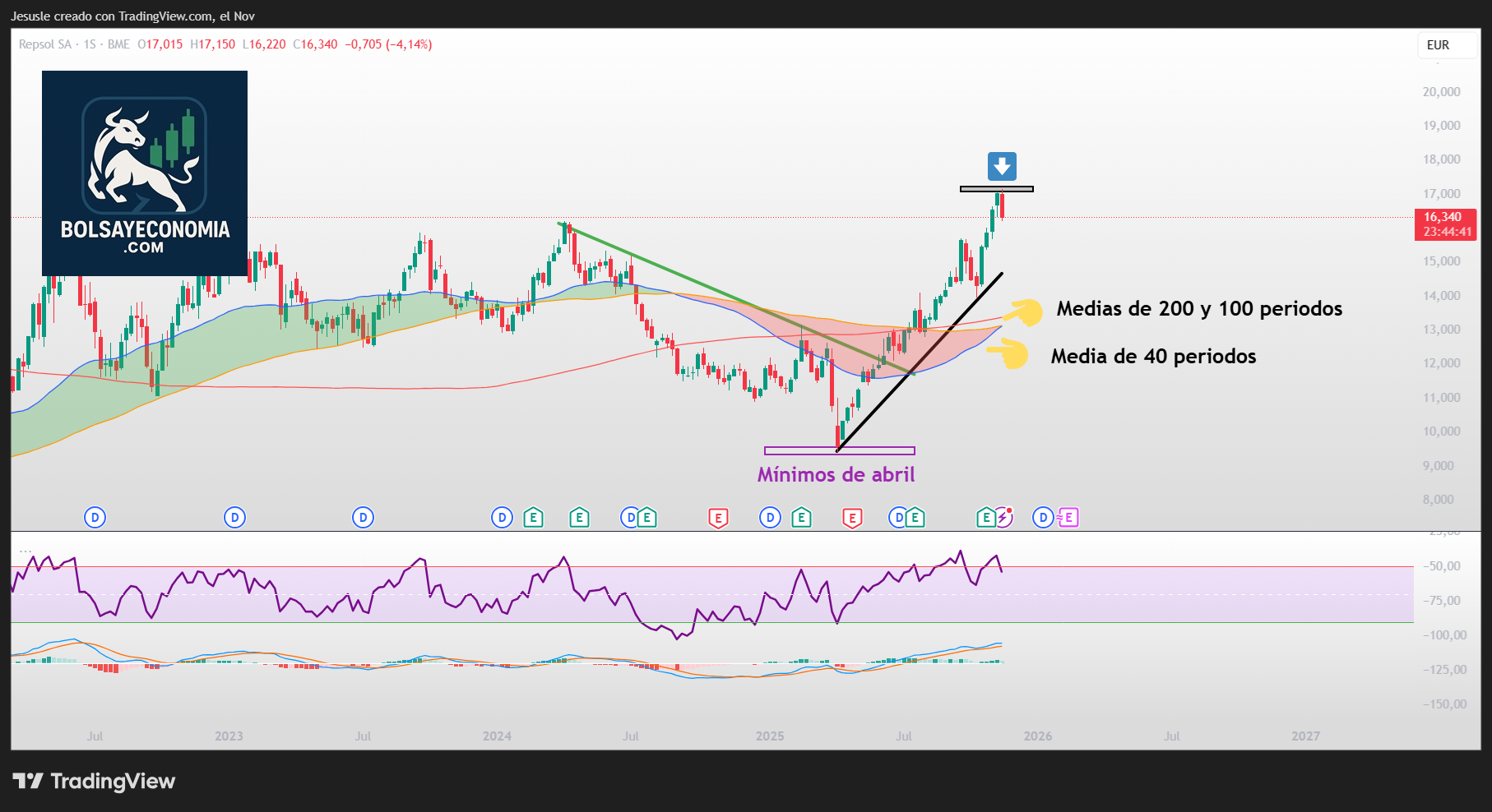 Repaso las resistencias en primer lugar sobre las acciones de Repsol, y en estos momentos vamos a tener en cuenta que, si consigue recuperar el nivel de los 17,15 € (máximos de este mes de noviembre), activaría fuerza de nuevo para mirar hacia la zona de los 17,50 €.