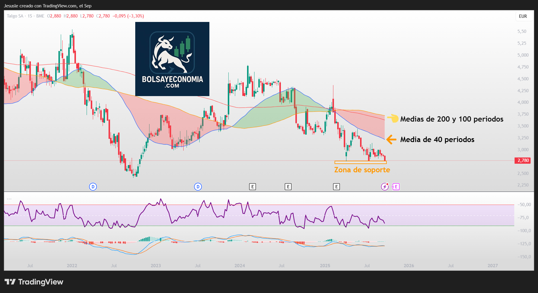 ❌ Por debajo, el soporte principal seguirá siendo el de los mínimos de abril en los 2,76 €. Perderlos sería una señal muy bajista sobre Talgo.