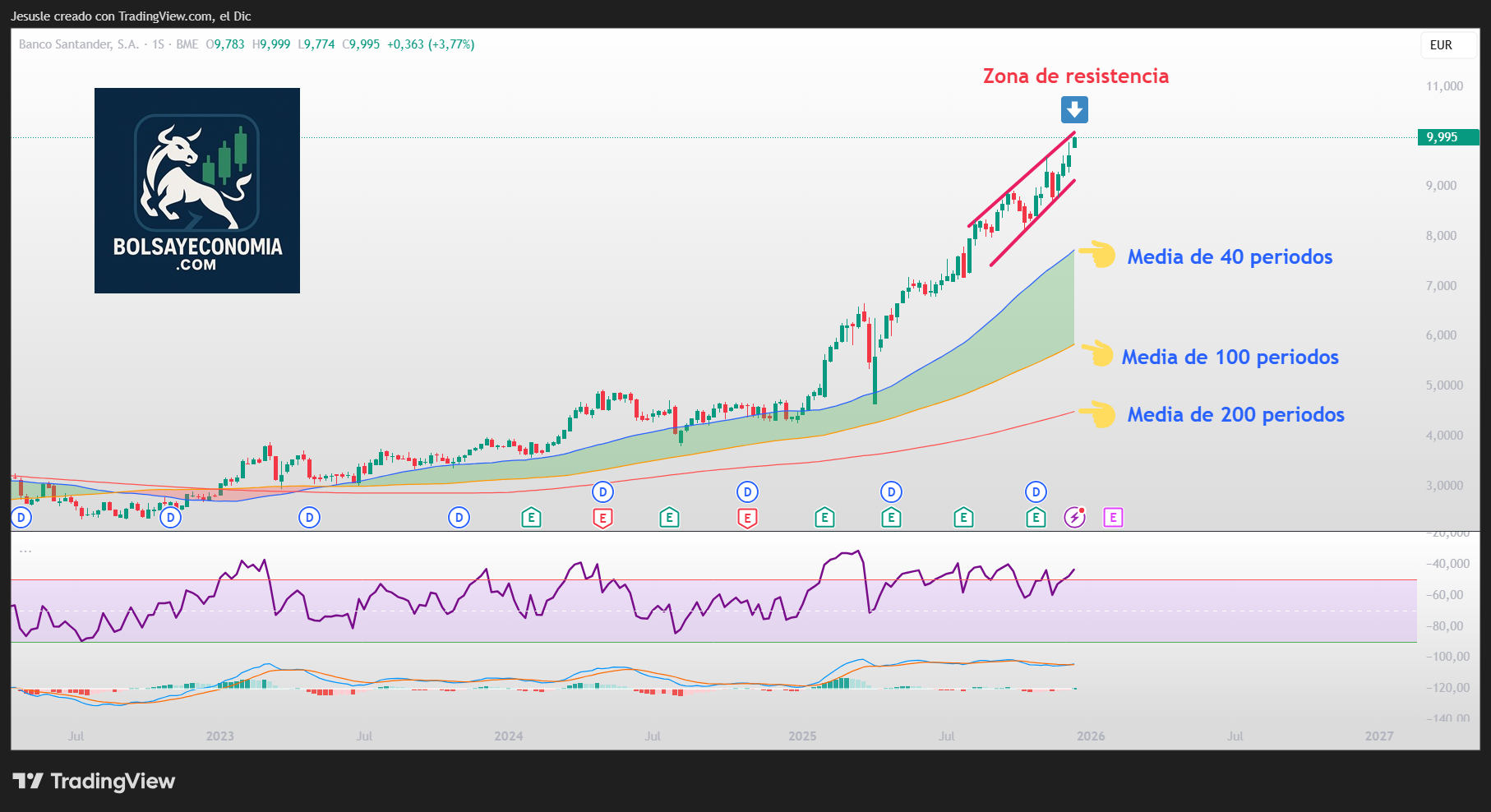 Otro detalle importante es que la cotización del Banco Santander continúa por encima de las medias de 40, 100 y 200 periodos en gráfico semanal, lo que reafirma la tendencia alcista actual de la entidad en todos los plazos.