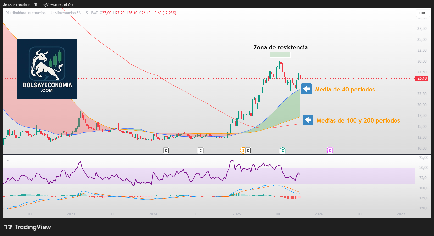 Un detalle muy importante es que la cotización de Dia sigue por encima de las medias de 40, 100 y 200 periodos en gráfico semanal, lo cual reafirma como alcista la tendencia actual en todos los plazos (corto, medio y largo).