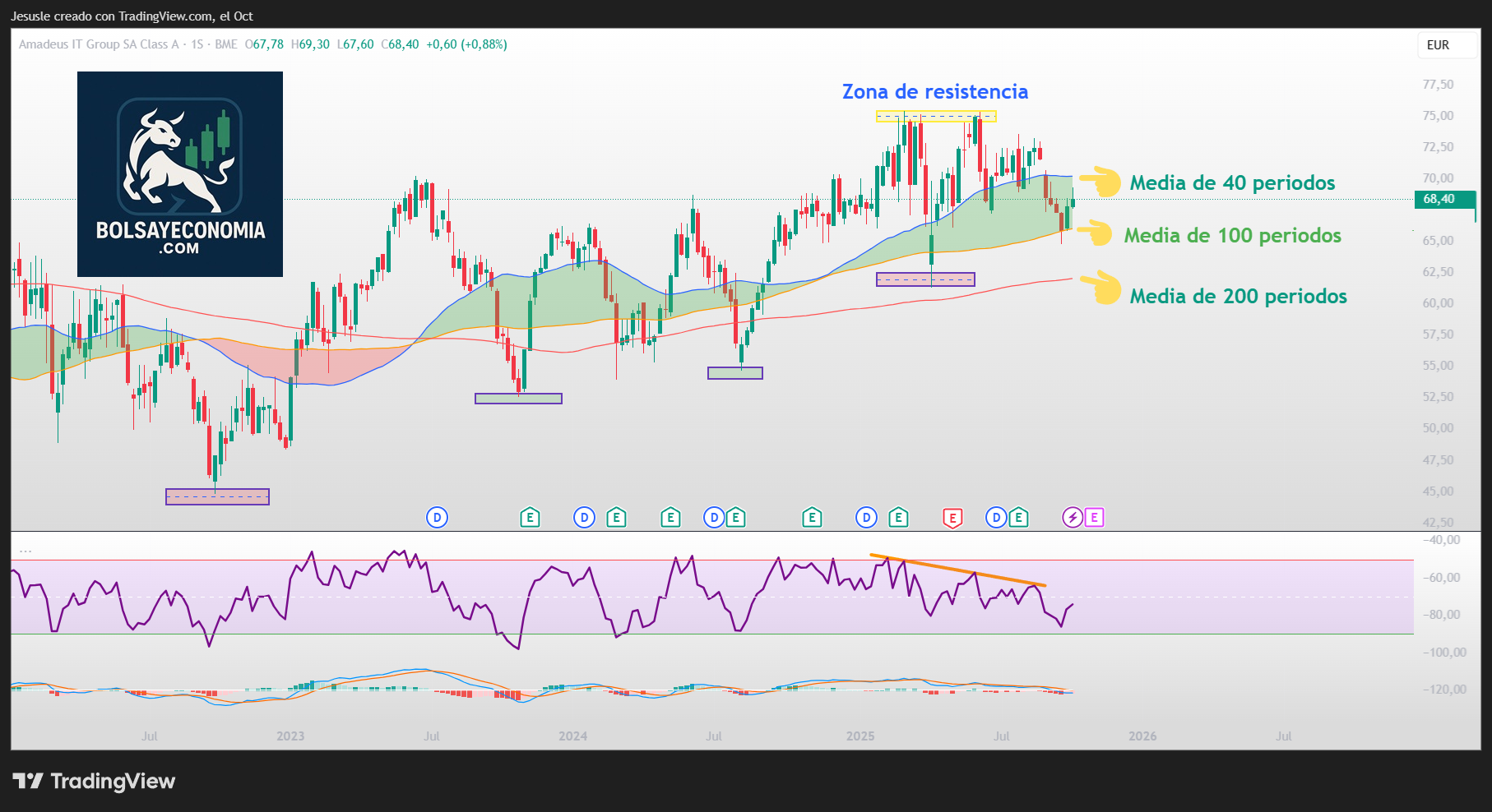 ✅ Para activar fuerza sobre las acciones de Amadeus y esperar que continúe recuperando terreno, debería situarse por encima de la media de 40 periodos en gráfico semanal.