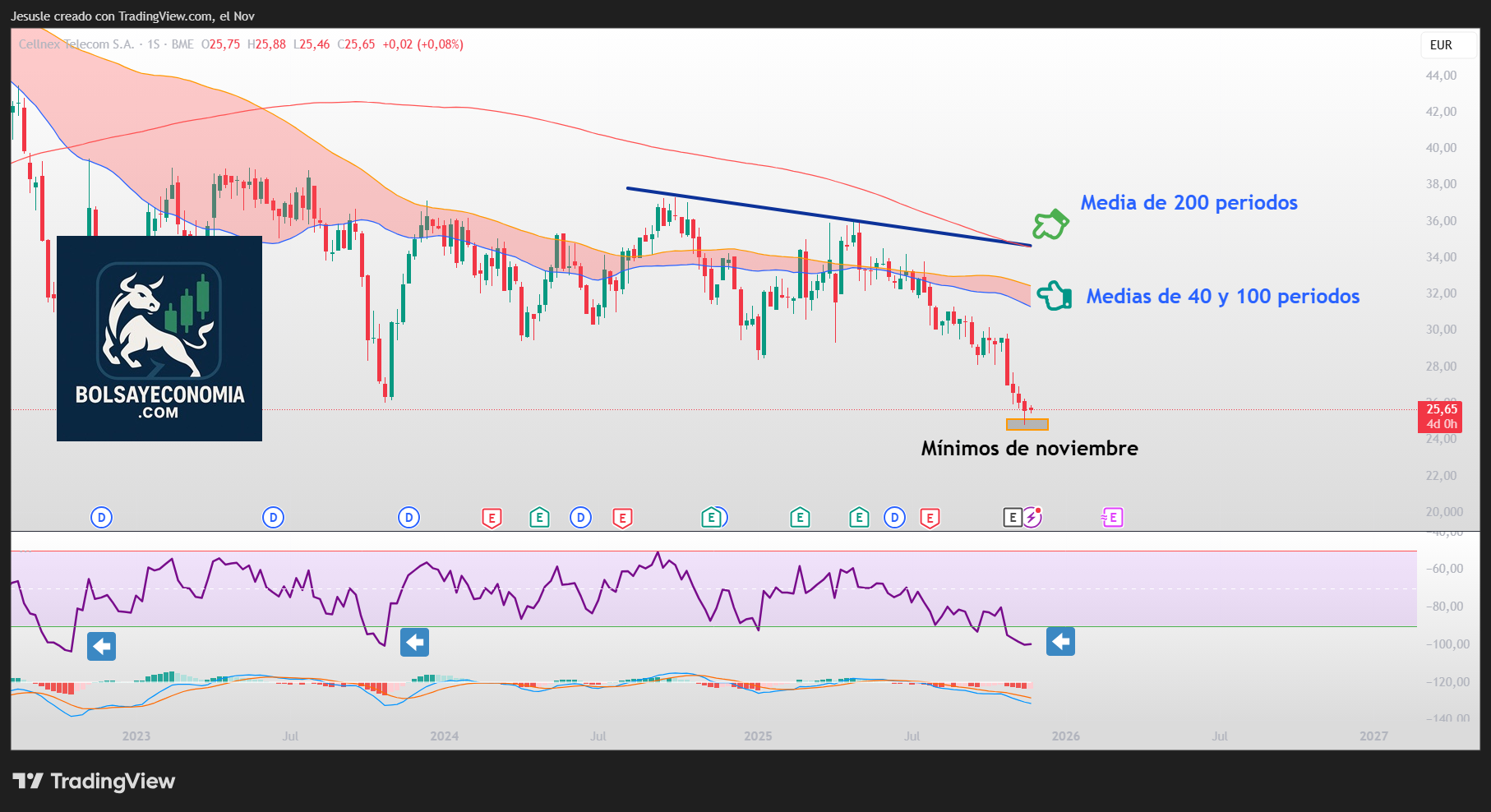 Otro detalle a tener en cuenta es que la cotización de Cellnex se mantiene por debajo de las medias de 40, 100 y 200 periodos en gráfico semanal. Esto reafirma la tendencia bajista en todos los plazos.