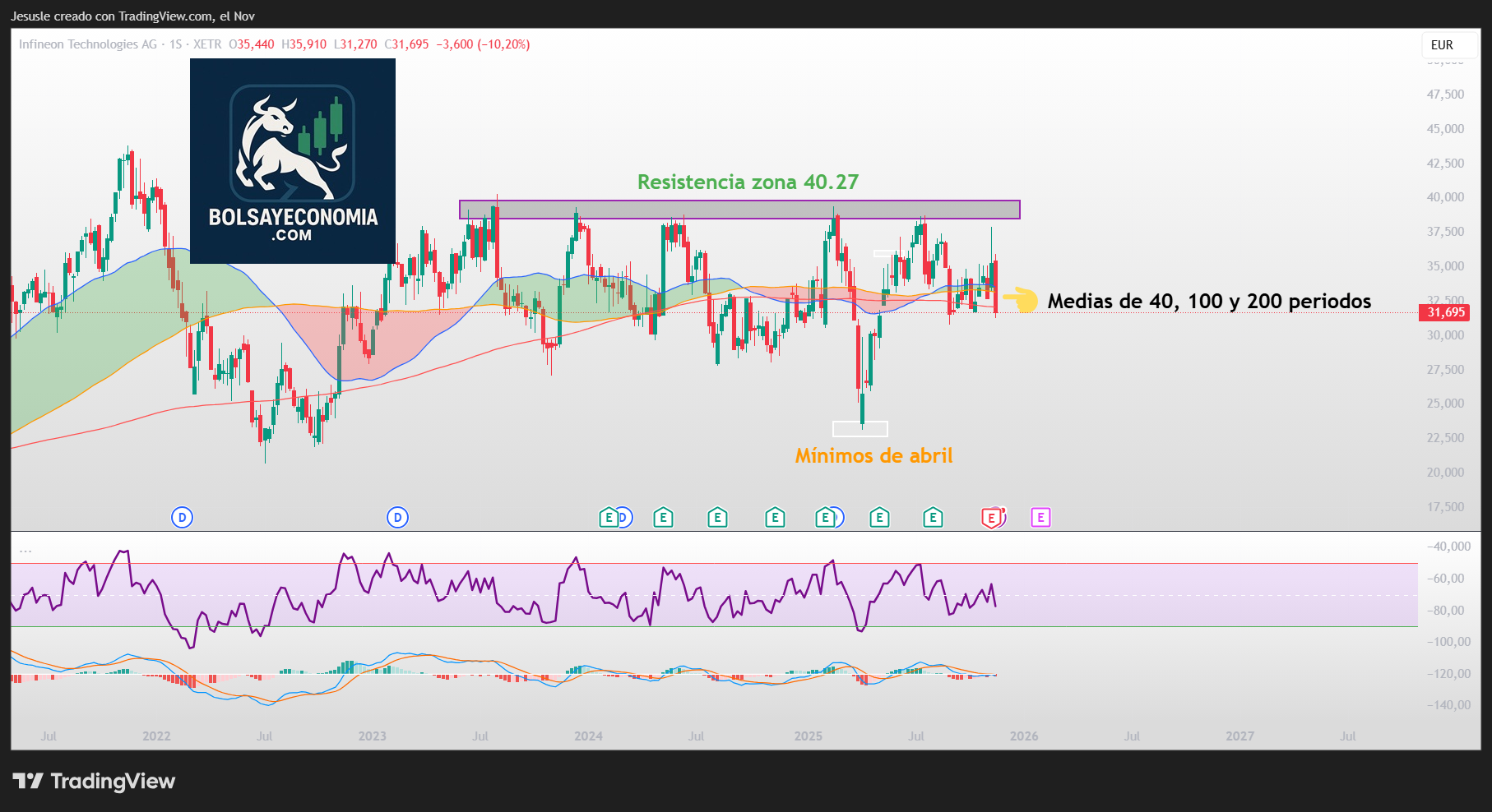 Por la parte baja nos vamos a fijar en la zona de los 31,25 € como primera zona de soporte a tener en cuenta sobre Infineon.