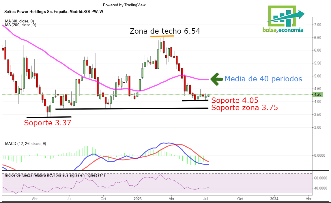 Por la parte de arriba vamos a mirar hacia la zona de los 4.50 euros por acción. Si Soltec en bolsa es capaz de ir hacia ella para recuperarla, nos indicaría algo de fuerza en el corto plazo para poder ir a buscar de nuevo la media de 40 periodos en gráfico semanal.