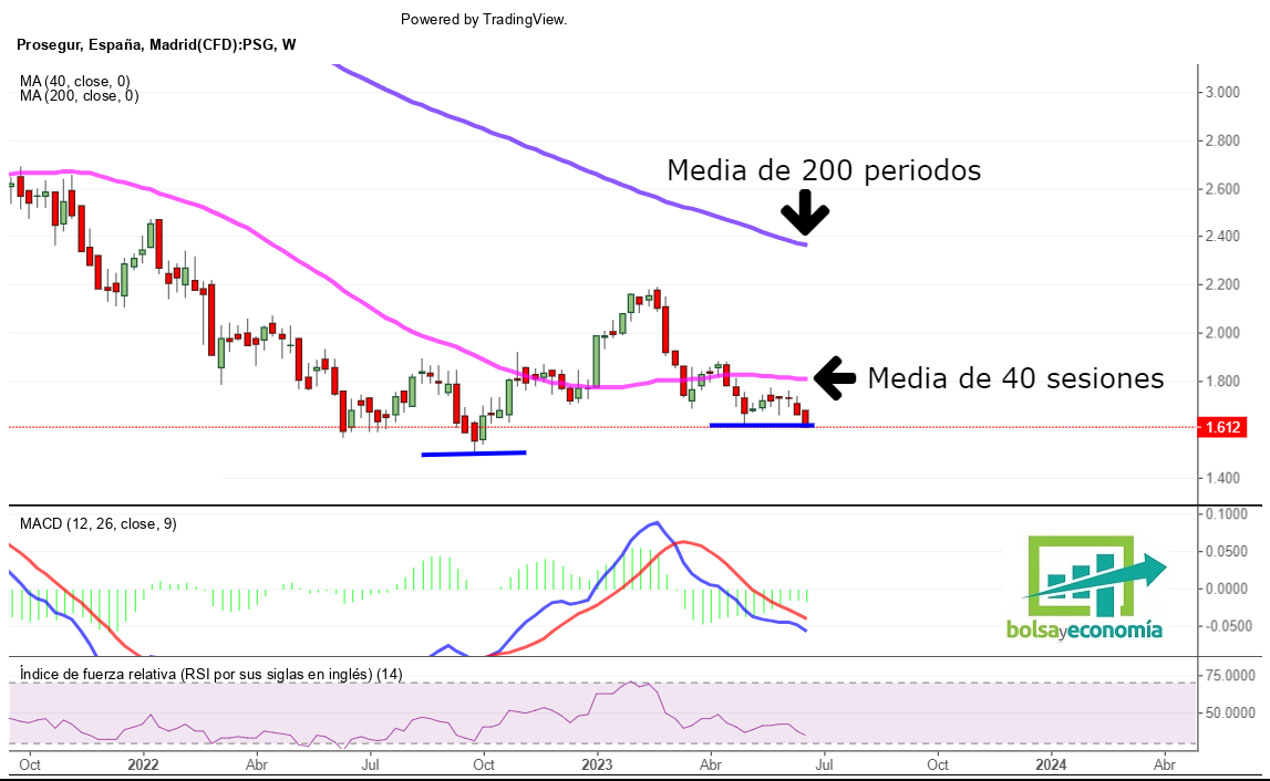Si es así, el siguiente objetivo bajista lo colocaría sobre la zona de los 1.50 euros (mínimos del mes de septiembre del año 2022). Ahí, tendríamos que ver si es apoyada la cotización de Prosegur para comenzar a rebotar o la pierde para seguir buscando zonas mas bajas de cotización.