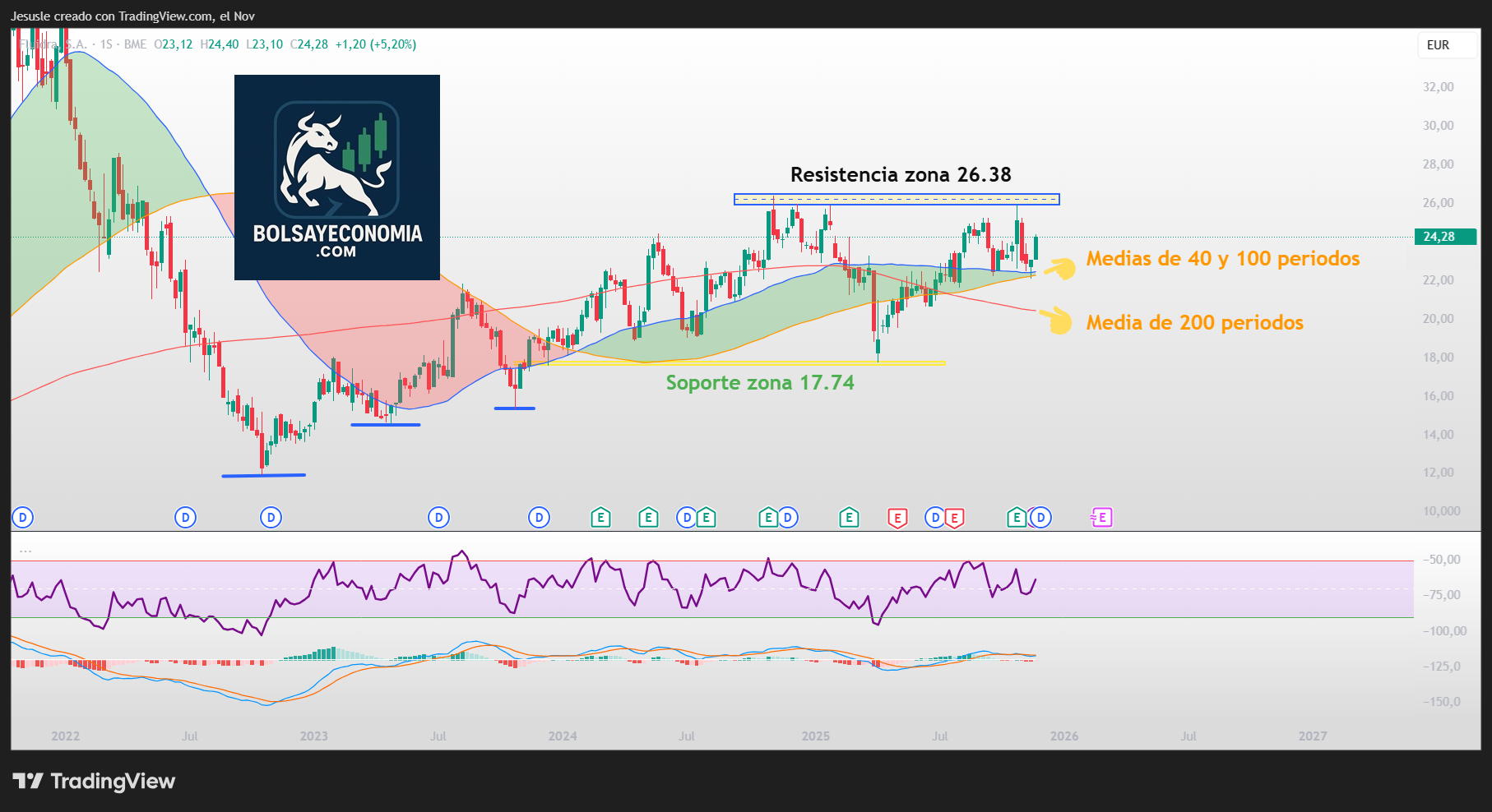 Por la parte de arriba, nos vamos a fijar en la zona de los 26,38 € como primera resistencia importante.