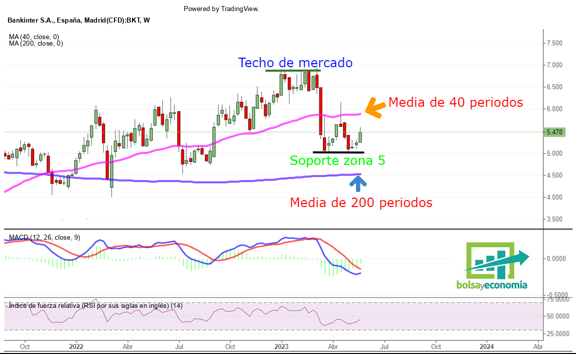 Si miramos el gráfico por su parte de arriba, hay que seguir teniendo en cuenta que la primera zona de resistencia importante la vamos a contemplar sobre los 5.89 – 6.16 euros por acción. Sobre ella, tenemos pasando la media de 40 periodos en gráfico semanal y los máximos dejados en el mes de abril de este año 2023.