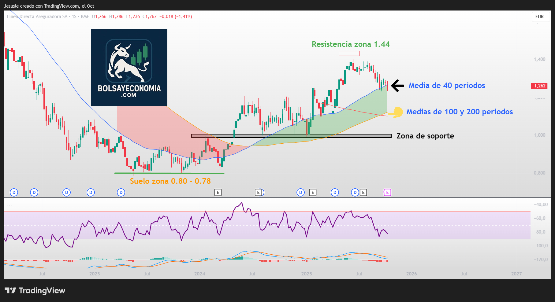 Gráfico semanal analizado sobre Línea Directa Aseguradora