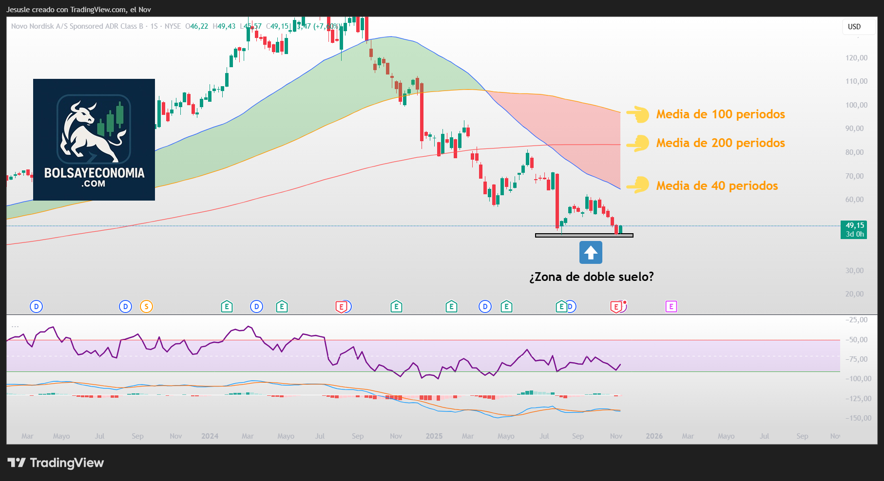 En el caso de las acciones de Novo Nordisk, esta semana se encuentran recuperando posiciones con fuerza, y ese movimiento nos está dejando formación de doble suelo creada entre los meses de agosto y noviembre de este año 2025.