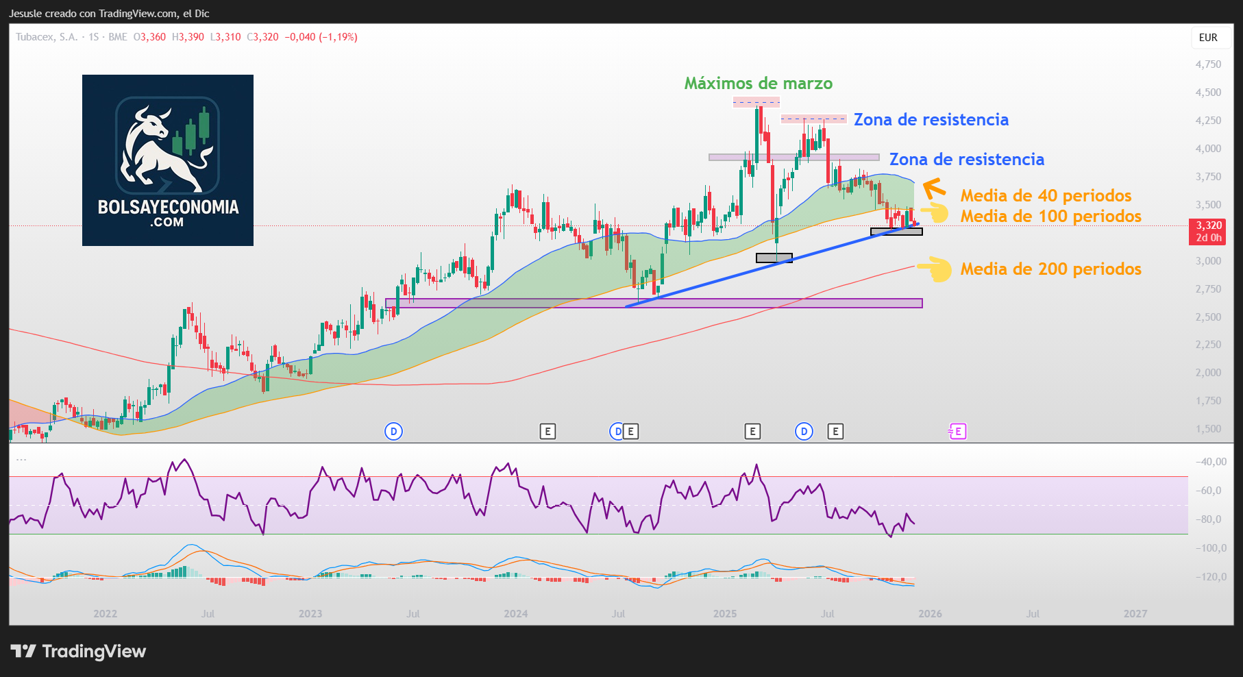 En primer lugar, me fijo en las resistencias, y la primera a tener en cuenta la situaremos en la zona de los 3,55 €.